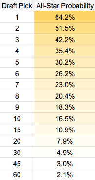 They didn’t receive an impact player from the Butler haul, and haven’t exactly nailed their lottery picks post-Thibs. For reference, here is a table of the estimated probability of making an All-Star team by draft pick, c/o Threes and Layups: