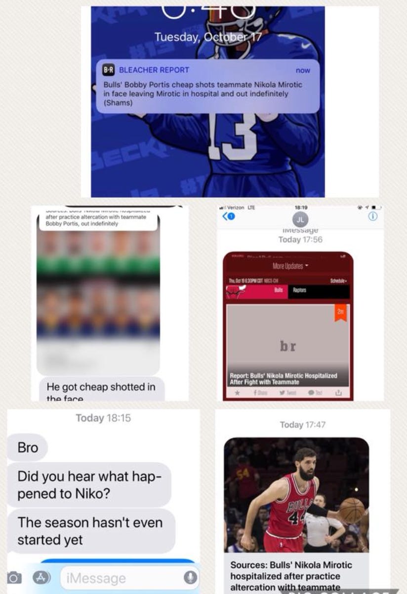 When this many people message me at once about the Chicago Bulls, it’s usually about their incompetence, like back in 2017, when Bobby Portis hospitalized his own teammate Nikola Mirotić by punching him in the face during a pre-season practice: